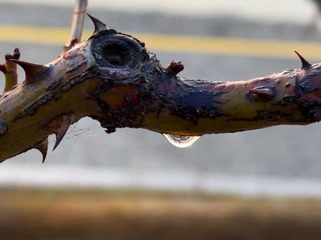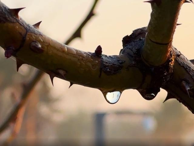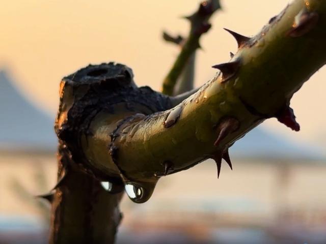 当清晨的第一缕阳光如金丝穿过淡薄的云层,穿透这层若有若无的寒意,洒落在月季园那些光秃秃的枝干上时,一幅奇妙的景象就此展开。挂在冬日月季花枝上的水珠,宛如被大自然精心雕琢的琉璃珍宝。有的圆润饱满,恰似珍珠,于枝头俏皮闪烁,每一道光芒,皆融阳光的欢畅;有的修长如泪,仿若流星,将坠落凄美演绎,每一丝微光,尽含决然的情绪;有的小巧玲珑,犹如宝藏,藏着梦幻的秘密,每一处晶莹,都隐神秘的气息。它们紧紧地依附在花枝上,恰似一群恋恋不舍的小精灵,又似在与月季共同抵御这冬日的清冷。